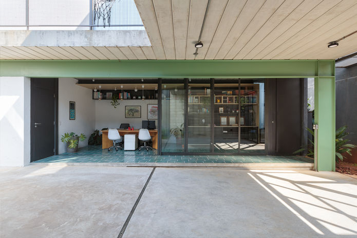 O térreo concentra os usos eventuais, como lazer, home-estúdio e o escritório dos arquitetos. Os usos cotidianos da casa ficam no primeiro pavimento.